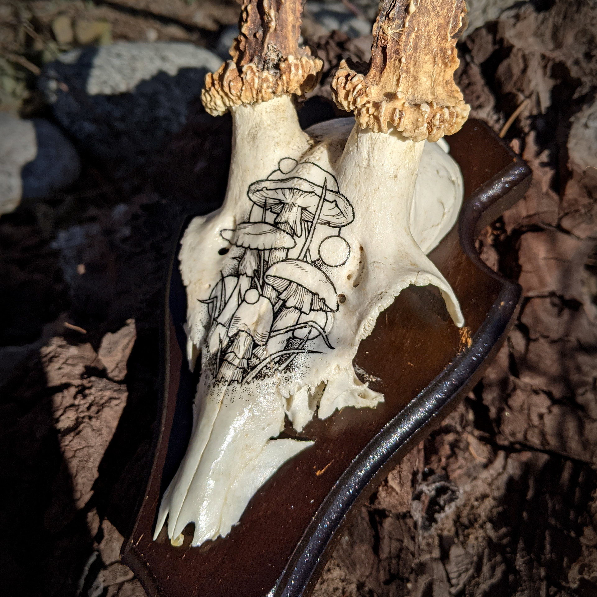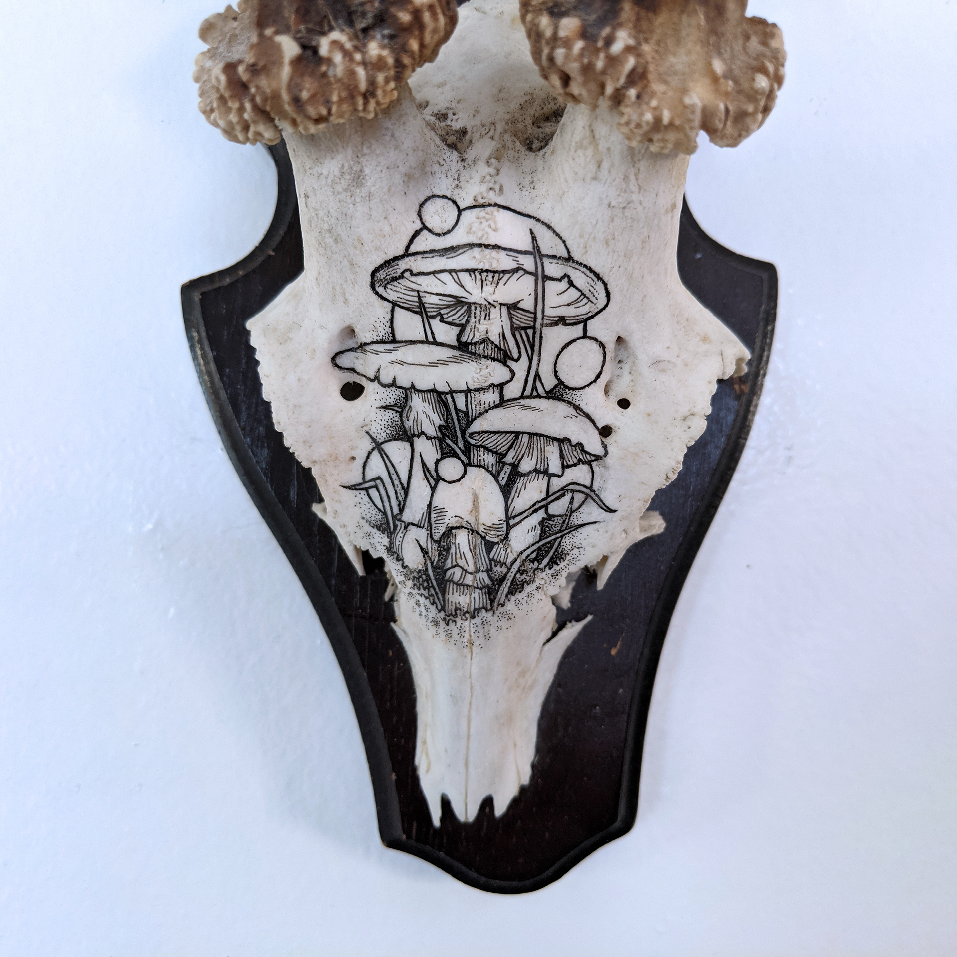 Fruiting Mycelium 02 - Destroying Angel - Ink on Vintage Roe Deer Skull, 2021