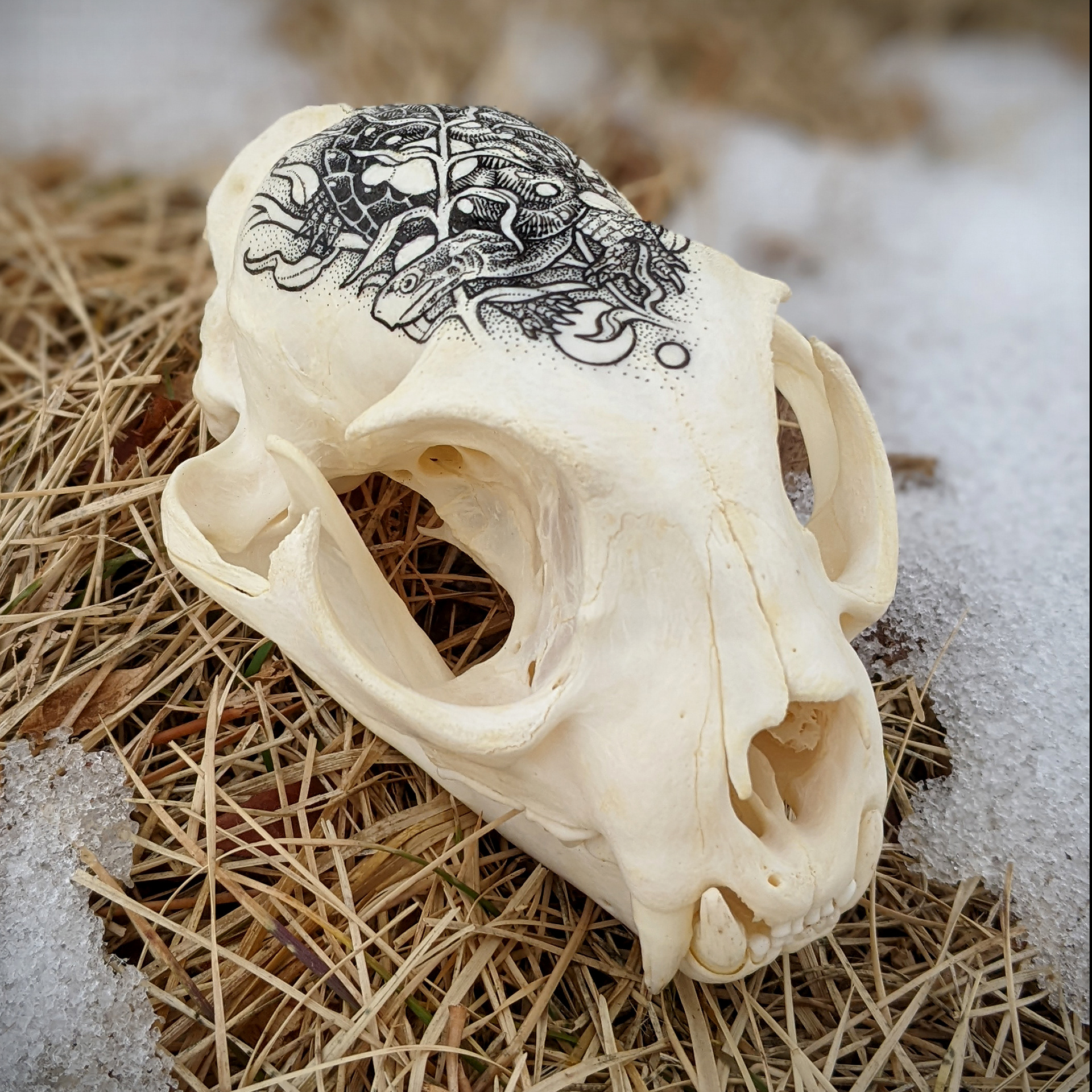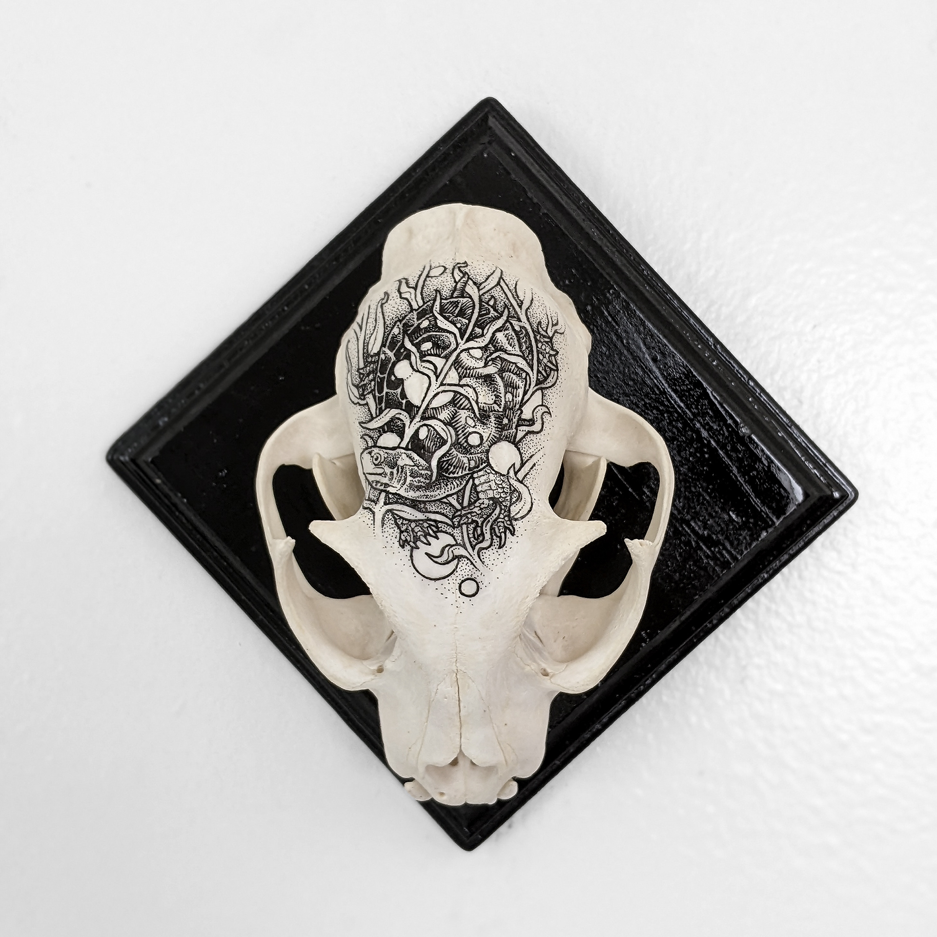 Spotted Turtle - Ink on Bobcat Skull, 2022
