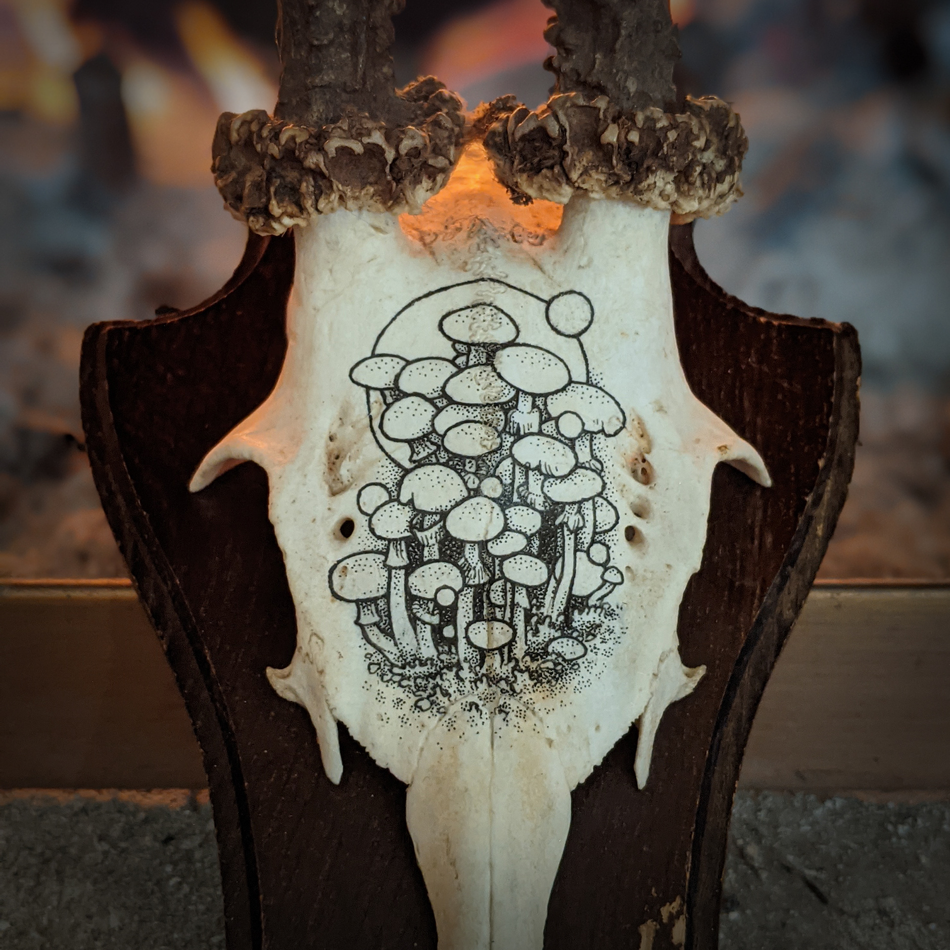 Fruiting Mycelium 03 - Psilocybe Cubensis - Ink on Vintage Roe Deer Skull, 2021