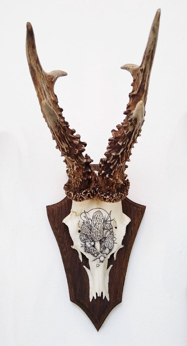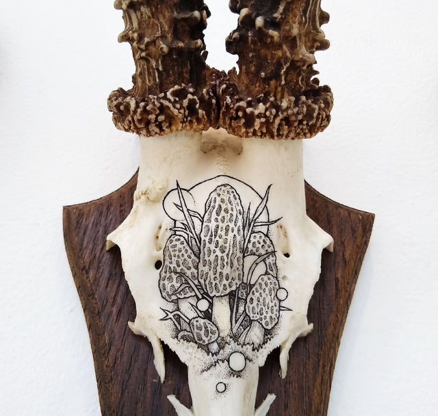 Morels - Ink on Vintage Roe Deer Skull, 2021