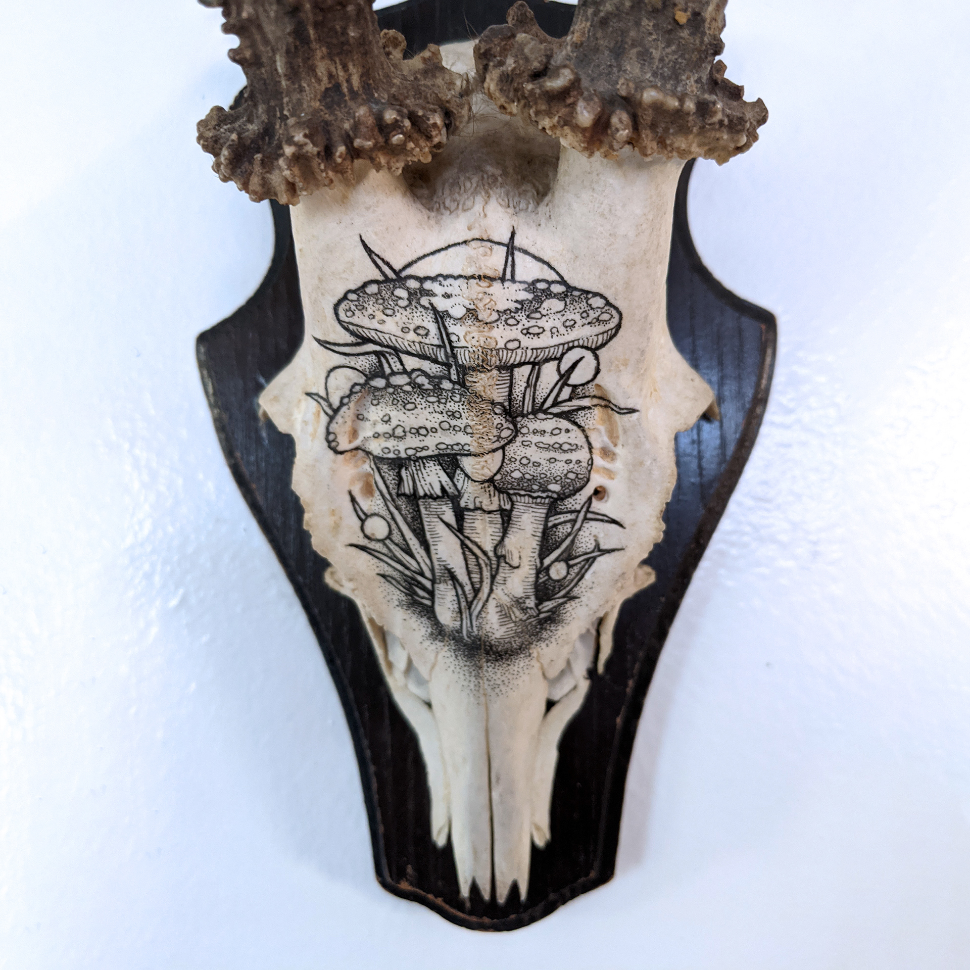 Fruiting Mycelium 01 - Amanita Muscara - Ink on Vintage Roe Deer Skull, 2021
